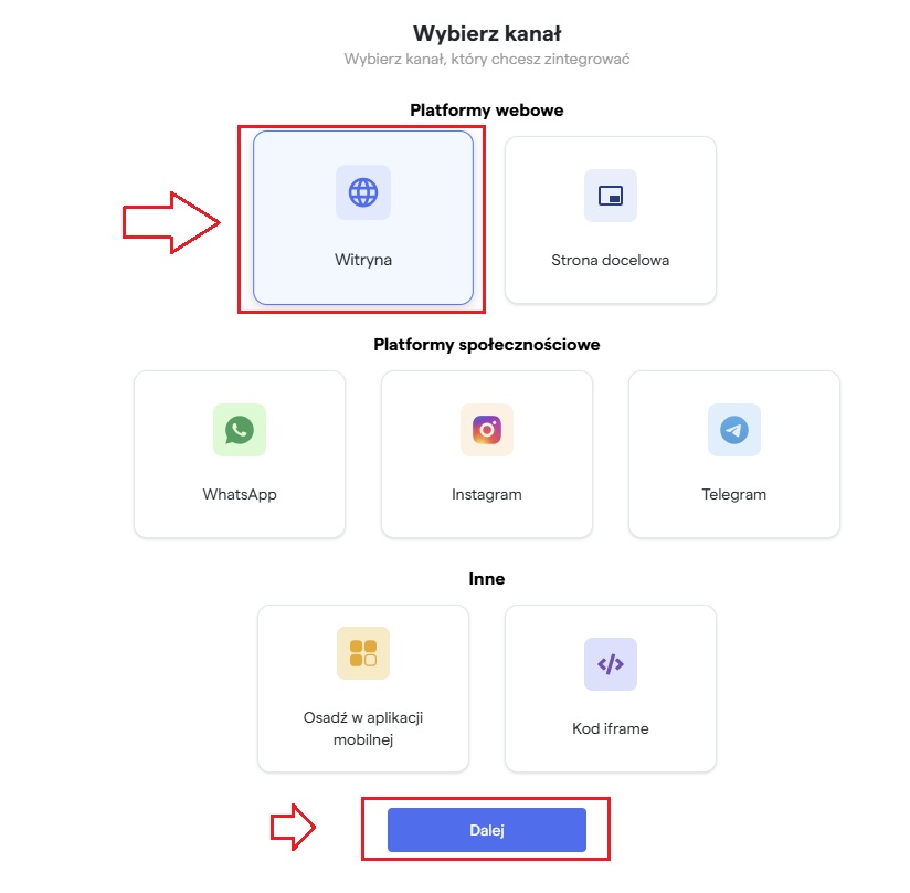 5. Wybierz platformę -> Witryna i kliknij „Dalej”