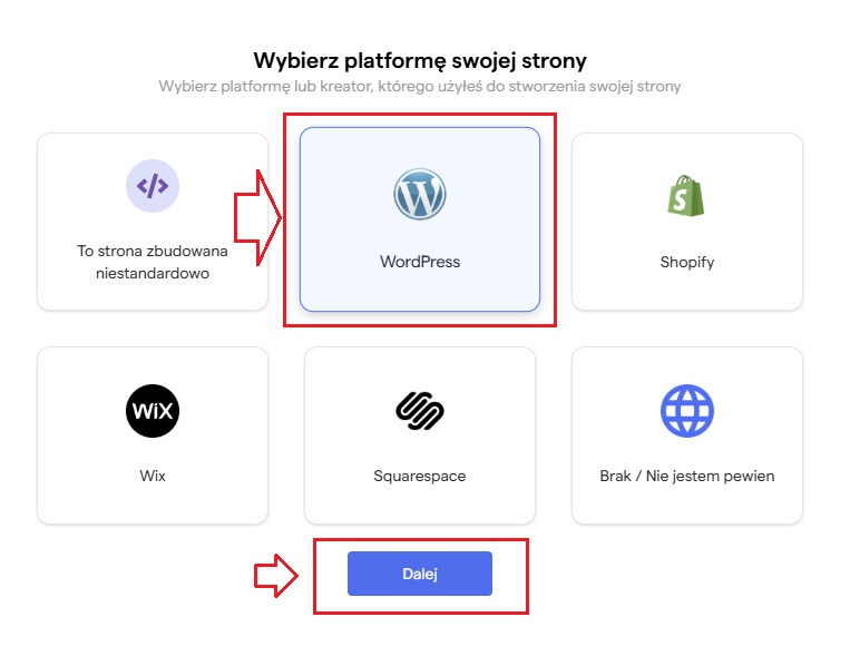 6. W kolejnym kroku jako Platformę swojej strony wybierz WordPress i przejdź „Dalej”