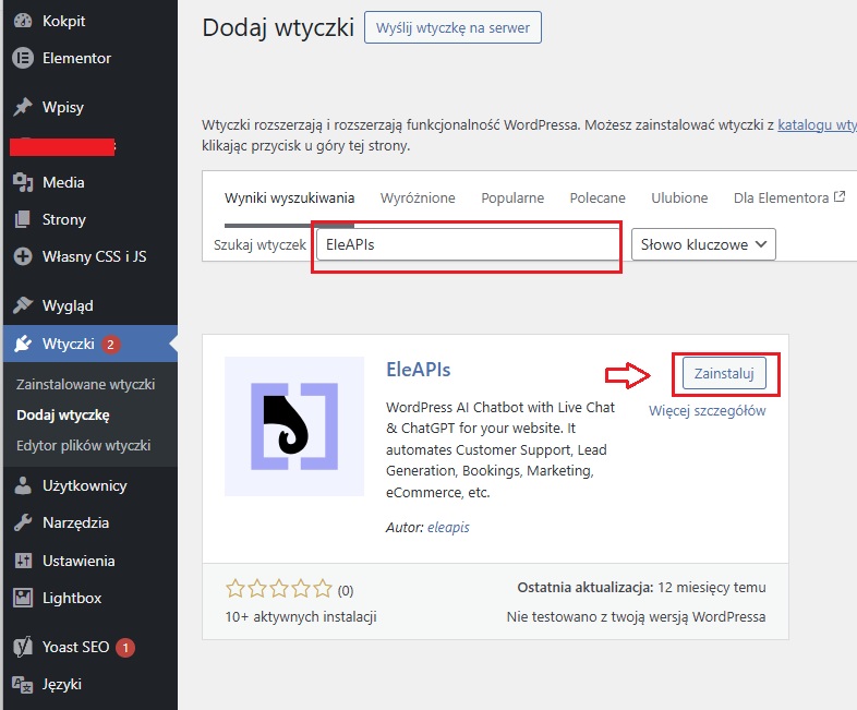 - W wyszukiwarce wtyczek wpisz EleAPIs.